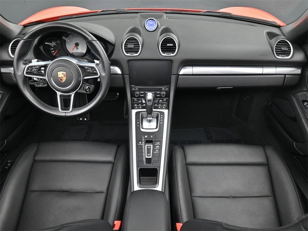 Features: 4-Wheel Disc Brakes, 6 Speakers, ABS brakes, Air Conditioning, Alloy wheels, AM/FM radio: SiriusXM, Apple CarPlay, Auto-dimming door mirrors, Auto-dimming Rear-View mirror, Automatic temperature control, Brake assist, Bumpers: body-color, CD player, Convertible roof lining, Convertible roof wind blocker, Delay-off headlights, Driver door bin, Driver vanity mirror, Dual front impact airbags, Dual front side impact airbags, DVD-Audio, Electronic Stability Control, Exterior Parking Camera Rear, Four wheel independent suspension, Front anti-roll bar, Front Bucket Seats, Front Center Armrest, Front dual zone A/C, Front reading lights, Fully automatic headlights, Garage door transmitter: HomeLink, Glass rear window, Headlight cleaning, Heated 2-Way Electric Sport Seats, Heated door mirrors, Heated front seats, High intensity discharge headlights: Bi-Xenon, Illuminated entry, Integrated roll-over protection, Knee airbag, Leather Shift Knob, Low tire pressure warning, Occupant sensing airbag, Outside temperature display, Overhead airbag, Partial Leather Seat Trim, Passenger door bin, Passenger vanity mirror, Porsche Communication Management, Power convertible roof, Power door mirrors, Power driver seat, Power passenger seat, Power steering, Power windows, Radio data system, Rain sensing wipers, Rear anti-roll bar, Rear window defroster, Remote keyless entry, Security system, Speed control, Spoiler, Sport steering wheel, Tachometer, Telescoping steering wheel, Tilt steering wheel, Traction control, Trip computer, Variably intermittent wipers, and Wheels: 19" Boxster S.